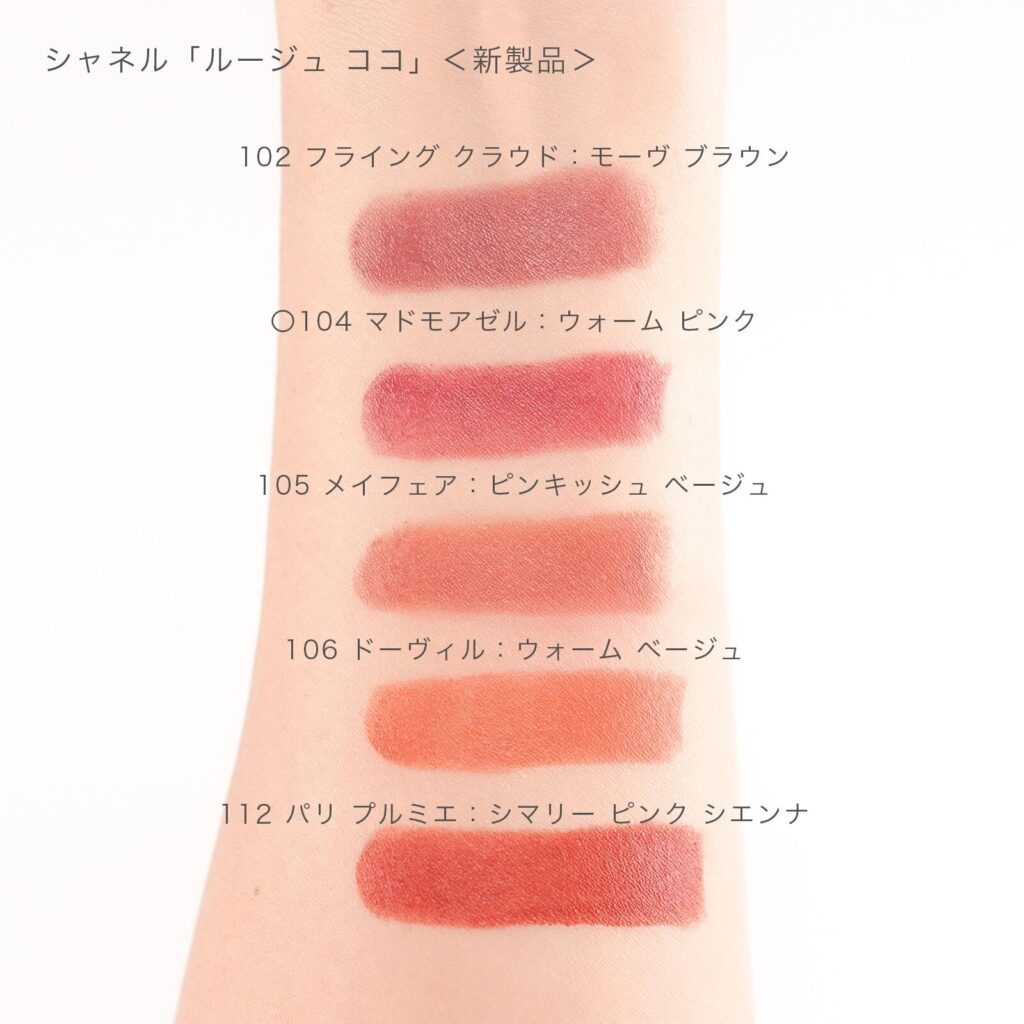上から) シャネル「ルージュ ココ」102、104、105、106、112 各6,490円<新製品>